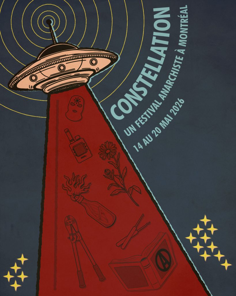 Et donc, nous vous invitons cher.es voyageur.euses de la galaxie anarchiste à nous rejoindre pour la 3e édition de Constellation. Le festival montréalais de l’anarchie sera de retour du 14 au 20 mai 2026, pour une semaine entière d’extravagance partout en ville, de livres, de zines, de savoir-faire, d’art, de musique et bien plus encore! Venez prendre part à notre expérience décentralisée durant laquelle les participant.es aident à donner le ton, créer le contenu et à lier ensemble théorie et pratique à travers divers espaces et par mille et une formules.