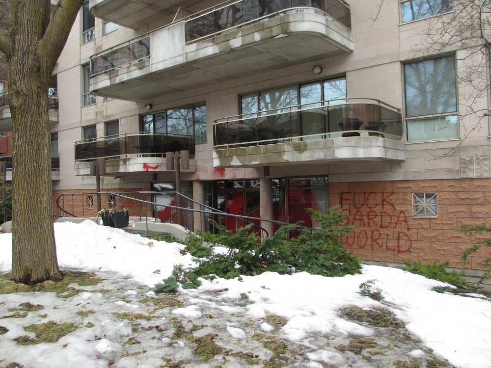 Le premier lieu, situé au centre-ville (1390 rue Barré), est un des quartiers généraux de l’entreprise, où sont entreposés plusieurs véhicules blindés dédiés au transport de l’argent liquide. Les vitres ont été enduites de décapant et les murs, aspergés de peinture. Des caméras ont été détruites et la serrure de la porte déborde désormais de crazy glue. Les deux autres lieux sont les résidences personnelles de deux administrateurs de l’entreprise : François Plamondon (résidant au 4450 rue Sherbrooke Ouest) et Jean-Luc Landry (résidant au 90 avenue Willowdale). Leurs devantures ont été recouvertes de peinture et de messages sur toute leur longueur. Les administrateurs de GardaWorld ne sont pas simplement complices, mais propagateurs des horreurs dont nous sommes témoins. Les façades de ces bâtiments seront plus faciles à nettoyer que leurs consciences. La peinture sur leurs fenêtres partira ; le sang sur leurs mains, lui, restera à jamais.