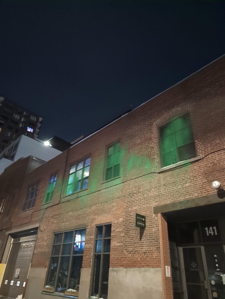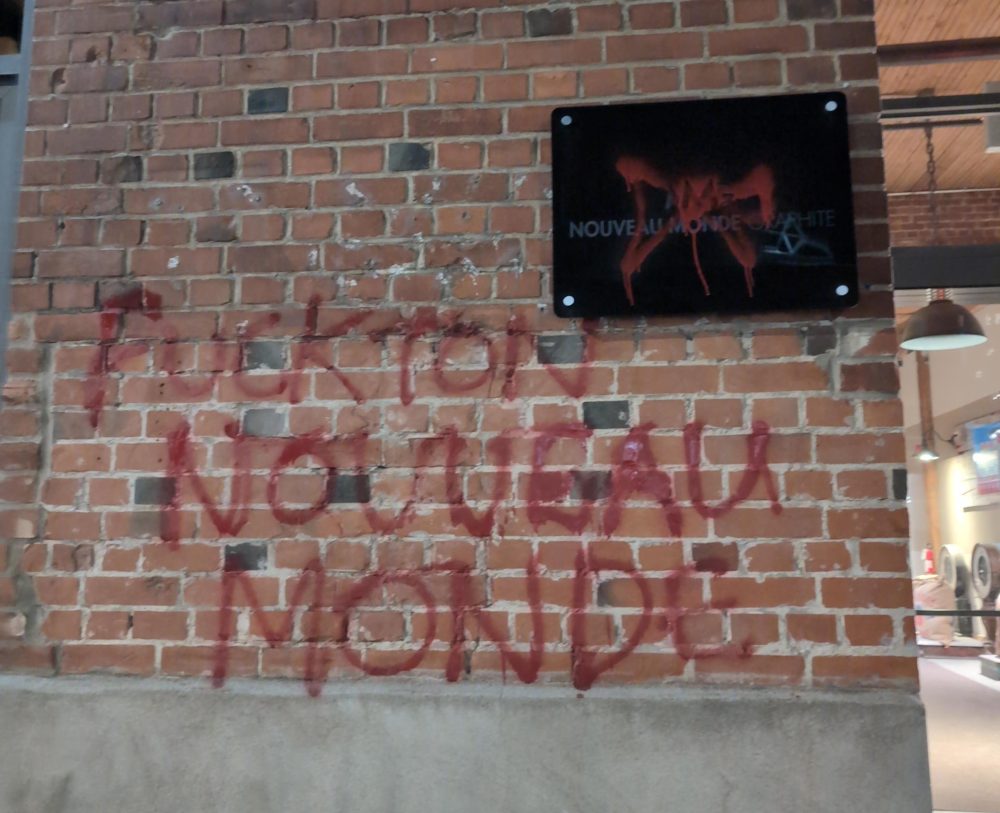 Des graffitis rouges disant « FUCK TON NOUVEAU MONDE » et une grosse quantité de peinture verte ont été récemment aperçus sur les bureaux de Nouveau Monde Graphite à Griffintown. Nouveau Monde Graphite est une entreprise québécoise spécialisée dans l’extraction et le raffinage du graphite. Elle prévoit construire la première mine à ciel ouvert entièrement électrique au monde à quelques heures au nord de Montréal, à Saint-Michel-des-Saints, et la construction devrait commencer cette année.