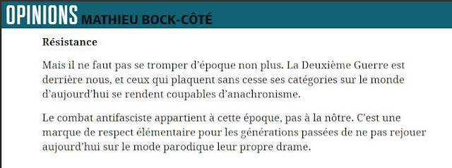 L’histoire nous a démontré que les institutions ont échoué à endiguer le fascisme. En Italie , le roi a donné le pouvoir à Benito Mussolini et en Allemagne les nazis ont été élus démocratiquement au Reichstag. N’en déplaise à Bock-Côté, il demeure impératif de tirer les bonnes leçons de l’histoire et d’empêcher chaque avancée potentielle d’une nouvelle peste brune. Nous le devons à toutes les victimes de la haine et du fascisme d’hier à aujourd’hui.