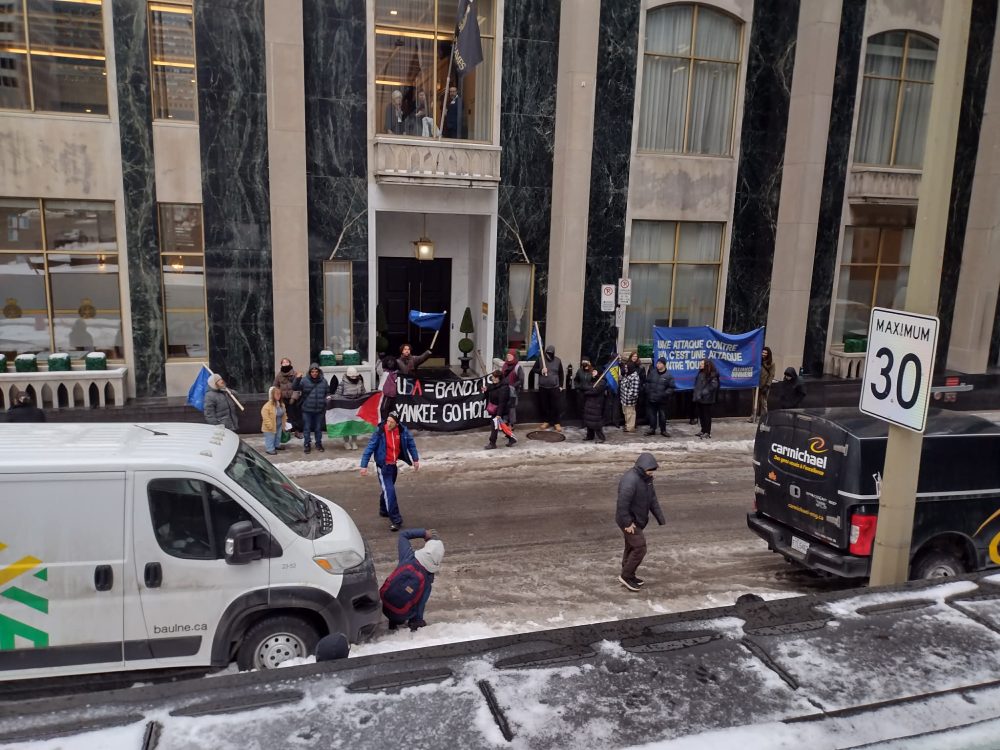 À 11h30 aujourd’hui, des militants du groupe Alliance ouvrière, accompagnés d’alliés anti-impérialistes, ont perturbé le déroulement d’une allocution de l’ambassadeur des États-Unis au Canada, Pete Hoekstra, qui se tenait au Club Saint-James. Les manifestants ont bloqué l’entrée principale, ainsi que l’entrée du stationnement du Club, retardant le début de la conférence. Après une intervention de la police, les participants à la conférence ont pu se faufiler par une entrée réservée aux employés. L’ambassadeur n’a pu accéder au bâtiment que sous escorte policière à 11h45, 15 minutes plus tard que le début prévu de l’événement.